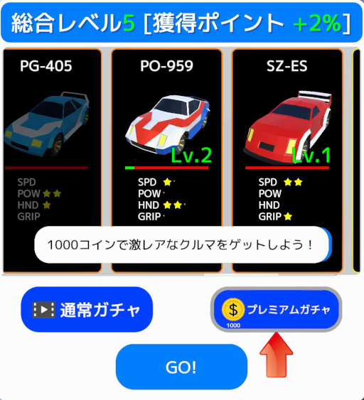 ライバルとのバトルに勝利するとコインがもらえるぞ! コインがたまったらプレミアムガチャを引いてみよう! 高性能なラリーカーをゲットするチャンスだ!