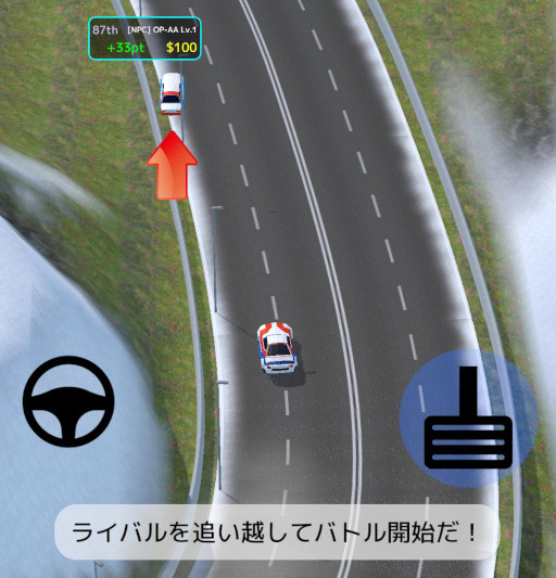 コース内にはライバルがたくさん走っているぞ。 ライバルカーを追い越してバトルを仕掛けよう! その場でシームレスにバトルがスタートするぞ!