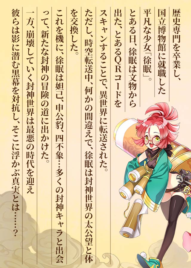 QRコードをスキャンしたらまさかのタイムスリップ!? 普通の女の子があの伝説の軍師太公望に入れ替り!!   ◆新感覚封神ストーリー◆ 幻想的史話奇書『封神演義』のキャラクターが多数登場✧ メインクエストをクリアして➾壮大なオリジナルストーリーを開放しよう! アニメーションの垣根を越えた映像表現も必見✦ 『元気封神』の世界をぜひご堪能くださいー ◆個性豊なキャラクター◆ おおらかな仙人 太公望 腹黒い狐娘 妲己 悪趣味な悪役 申公豹 色っぽい霊獣 四不象 ………… 個性豊で魅力的なキャラクターたちが君の召喚を待っている! レベルや星級、法宝や符石アイテムなど、育成要素満載☆ 好きなキャラクターと共に、勝利の栄光を! ◆戦略性に富んだバトル◆ 4つのジョブ×多彩なスキル×キャラクター、組み合わせは無限大! 攻撃UP、HP回復、気絶、スキル封印……様々な法術カードを駆使しよう❏ 自分だけのチームと独自の戦略で勝利をつかめ!! さらに「PVPモード」でのリアルタイムバトル機能搭載 1v1!2v2!ギルド戦…多種多様なモードを楽しめる! ※戦略バトルが苦手でも安心の「AUTO」機能付き ◆ドハマリ豊富なコンテンツ◆ ギルド、メインクエスト、乱闘、万仙会、謎の任務、斬仙陣…… 様々なコンテンツで飽きさせない! チャット機能に可愛いオリジナルスタンプ付き、 対戦中に相手とスタンプをどんどん送り合える! 楽しくスタンプを使ってバトルを盛り上げよう! ◆魅力的なキャラクターボイス◆ ・岡本信彦 ・小倉唯 ・佐藤利奈 ・田中理恵 ・花江夏樹 ほか多数…豪華声優陣が封神の世界であなたを待っています♡ ------------------------------------ 【推奨環境】 OS :iOS 8.0以降   Android 4.4以降(4.4を含めず) RAM:2GB以上 ※推薦環境以外からのご利用の場合、サービスを正常にご利用いただけない可能性がございます。予めご了承ください。