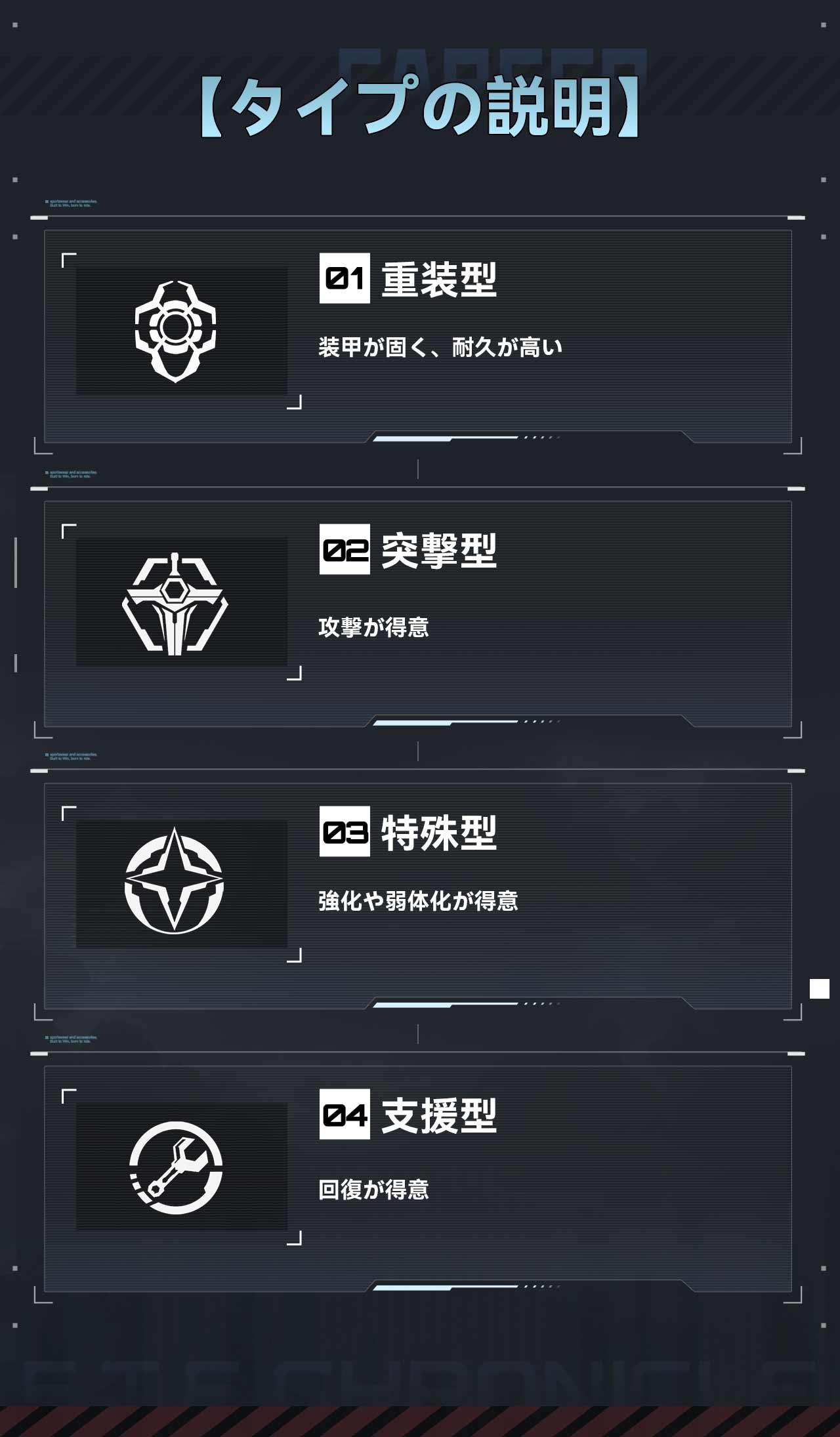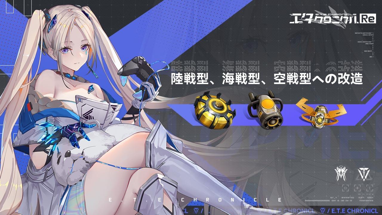 E.T.Eには、戦場のタイプに応じて陸戦型E.T.E、海戦型E.T.E、空戦型E.T.Eといった種類が存在します。それぞれに得意な戦場がありますが、改造デバイスを使用し、属性を補うことで、不得意なタイプの戦場でも戦うことができるようになります。
