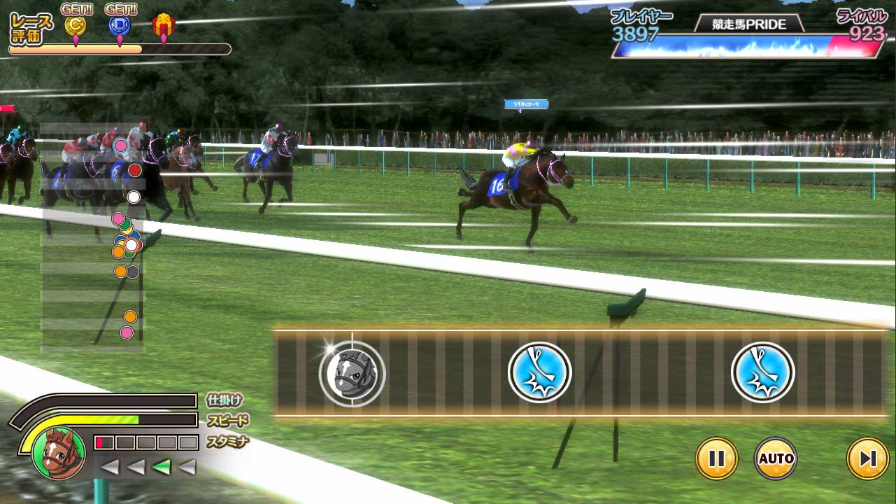 馬齢、距離、芝ダートなど適正なポジションに手に入れた競走馬を配置し、レースに出して勝利を目指すゲームです!レースシーンは作戦カードを選ぶだけのシンプルな操作で、レジェンド馬から現役馬まで実名で登場しているのがアツいです!