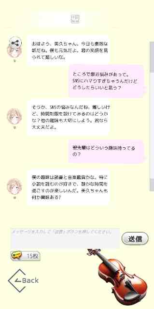 フリーテキストによるチャットが可能。 送ってすぐに返信がくるから、寂しい夜も大丈夫。 最終的には5人のキャラクターと話せるようになるよ。