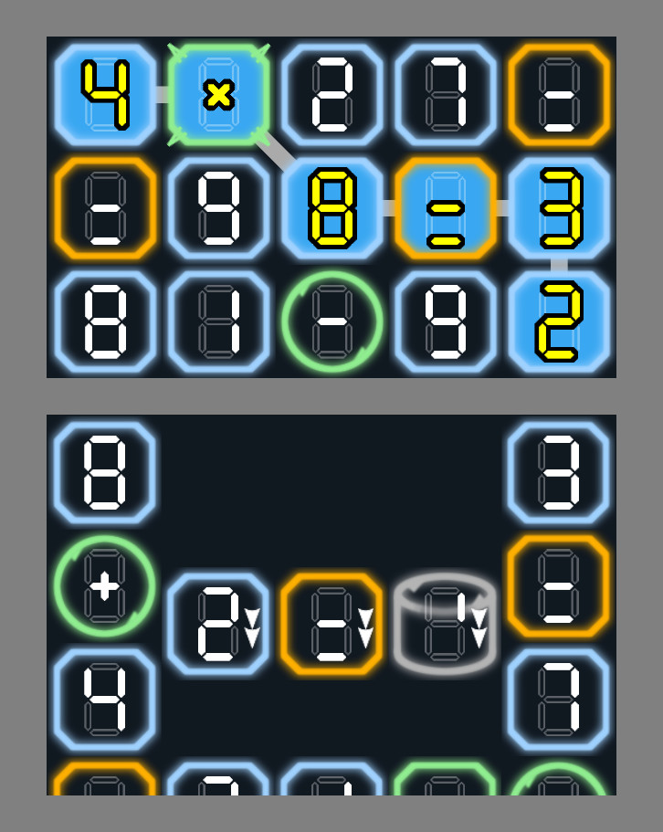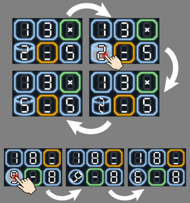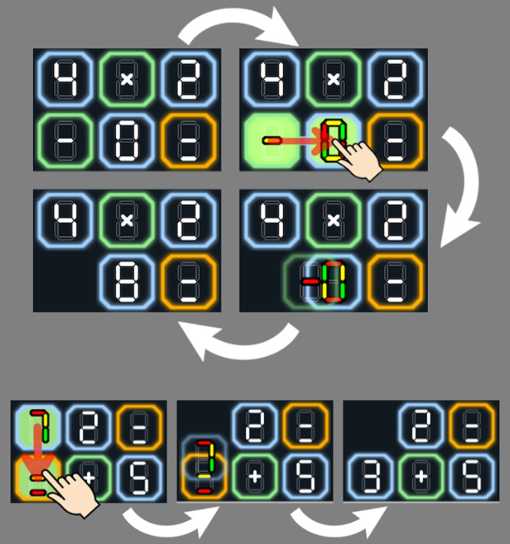 マッチ棒パズルの要領で数字を合体できます。 例えば「-」と「0」で「8」になったり。 あるいは「7」と「=」で「3」にしたり。
