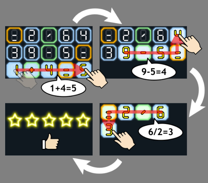 数字をなぞって数式をつくります。 全部消すとステージクリアー。