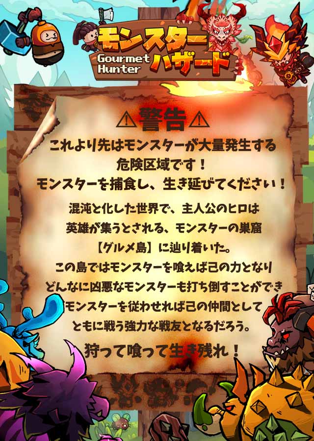 事前登録で可愛いコラボ限定英雄ゲット! ■ゲームストーリー ※警告※ これより先はモンスターが大量発生する危険区域です! モンスターを喰らい、生き延びてください! 人間、動物、植物、幻獣… 生あるモノは突如としてモンスターと変異し、この世界を侵食していた。 この世界を救うためには、敗北する事は決して許されません。 混沌と化した世界で、主人公のヒロは英雄が集うとされる、モンスターの巣窟【グルメ島】に辿り着いた。 この島ではモンスターを喰えば己の力となり、どんな凶悪なモンスターの大群からも生き残る事ができ、モンスターを従わせれば己の仲間となり、ともに戦う戦友となる! 大量のモンスターを狩り、究極のモンスター料理を捕食して最強の力を手に入れよう! 狩って喰って強くなれ! ■ゲーム紹介 グルメ×冒険×RPGの要素を融合した、片手のみの簡単操作! 英雄を率いてモンスターを倒そう! モンスター料理でパワーアップ!冒険グルメRPG! ■ゲーム特徴-片手操作で移動時間や空いた時間を利用してサクサクプレイ! -敵の行動、攻撃パターンなどを掴み、自身の操作によっても戦況が変化できる! -シンプルな操作、システムにより誰にでも楽しめるゲーム性! -競技場やギルド戦、レイドボスにくわえ、料理、村建設、ペット、育成などプレイヤーを飽きさせないボリュームあるコンテンツが存在! -キャラをモンスター料理を食べて強化! -ボスを討伐し、強敵を強力な仲間に! -モンスターを倒して食材から調合し、究極料理を作ろう! -大量に迫りくる敵や巨大ボスを撃破する爽快感! -簡単操作の爽快RPG! ■モンスターハザード グルメハンター冒険グルメRPGはこんな方にオススメ ・新感覚のゲームをプレイしたい ・空いた時間にサクッとできるゲームがしたい ・可愛いキャラを引き連れて冒険したい ・複雑な機能やゲームシステムが苦手 ・ハクスラ要素のあるRPGがしたい ・1人でも複数でも楽しめるゲームが好き ・戦略を練って強力な敵を撃破するゲームを探している ・敵の技を自身の操作でかわしたり、操作性を含むゲームが好き ・簡単操作のゲームがしたい ・爽快感のある冒険がしたい ・ペットの育成や街を建設していくゲームも好き ・1vs1やギルドコンテンツ、ペットや育成、建設、料理など様々なコンテンツがあるゲームがしたい