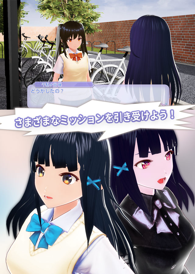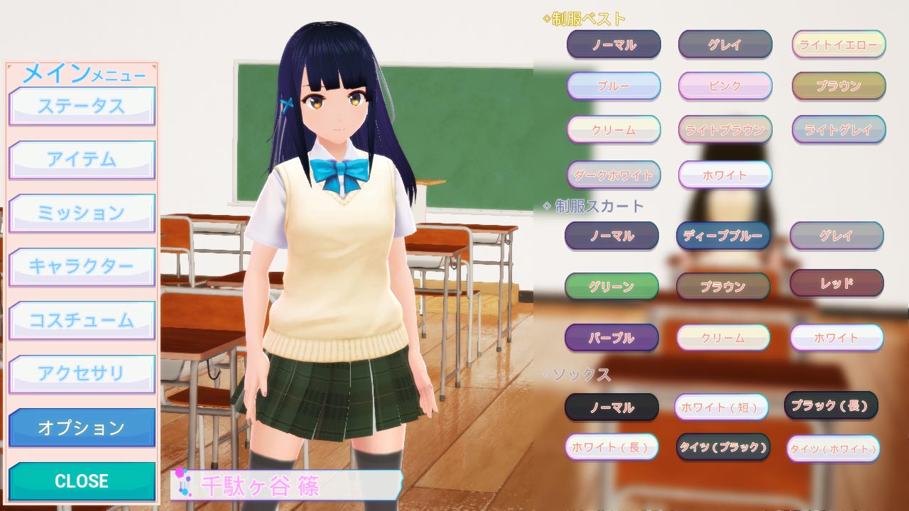 制服のベスト、スカート、ソックスのカラーをカスタマイズ。 ゲーム中で素材を入手してカラーバリエーションを増やしていこう!