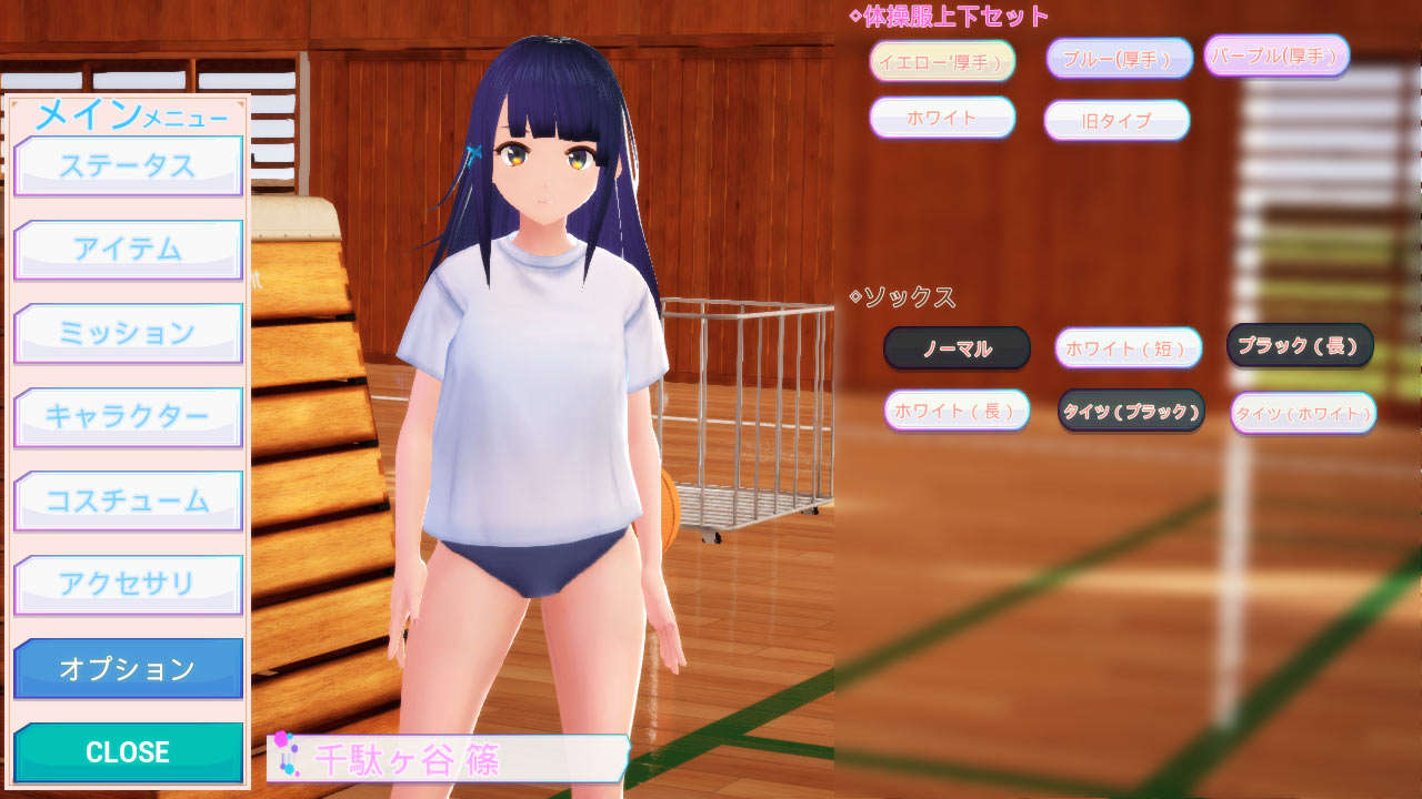 体操服の上下セットとソックスの組み合わせをカスタマイズ。 ゲーム中で素材を入手してカラーバリエーションや体操服の種類を増やしていこう!