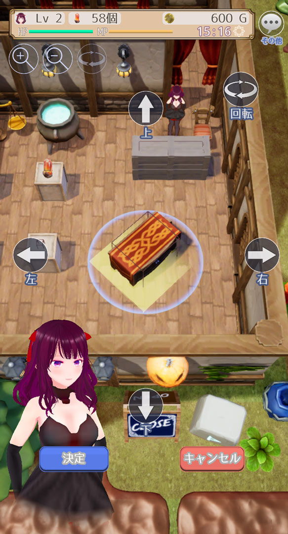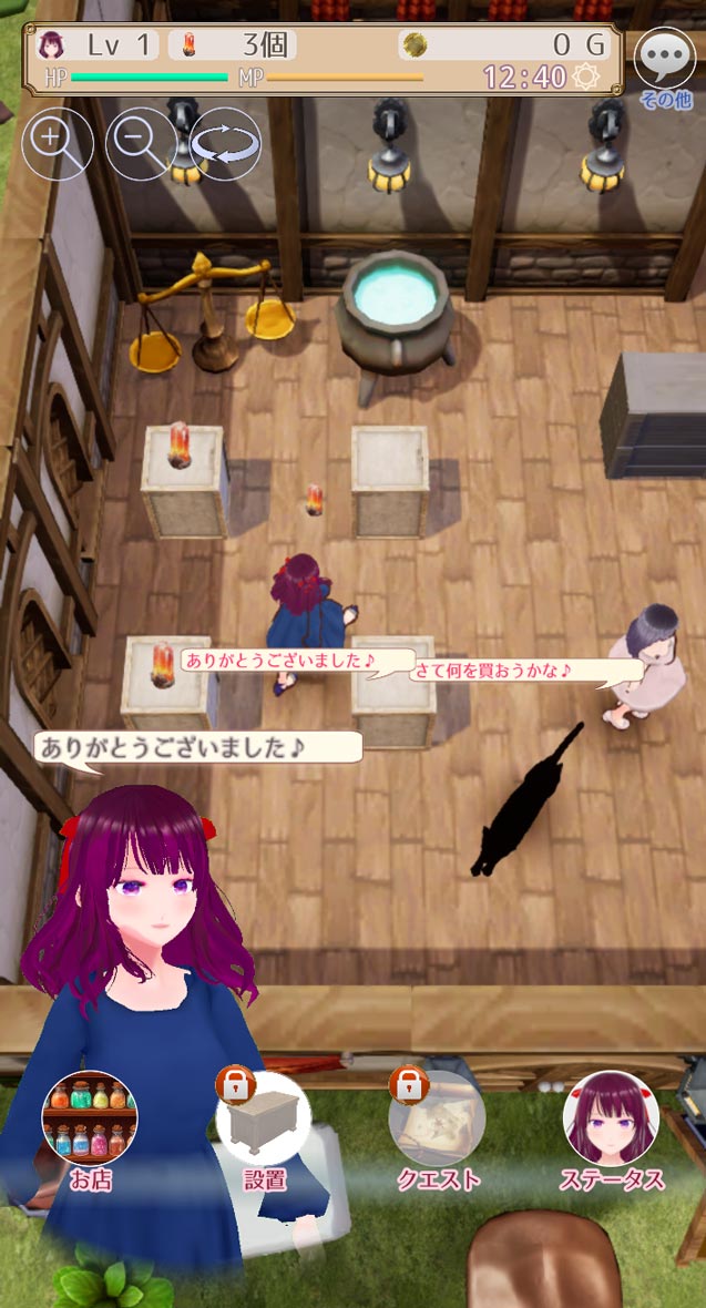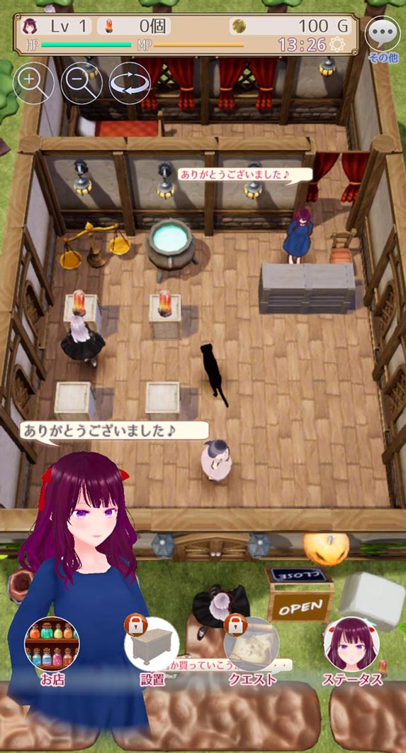 お店の内装と外側に自由にオブジェクトを配置することができます。 商品を並べると机を配置したり、お店の外には花壇や不思議な魔法オブジェクトをなどを配置したりすることができます。 配置の仕方により、お客さんの行動にも変化があります。