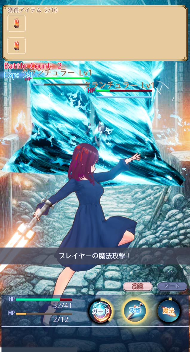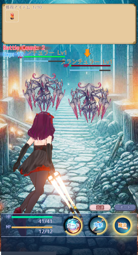 各コマンドごとにゲージがあり、フル状態で発動できます。 ガード、攻撃、魔法をうまく使い分けて敵を倒していきます。 ※高速、オート機能もあります。