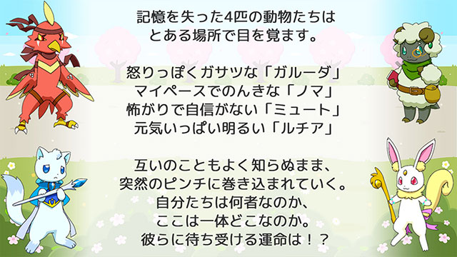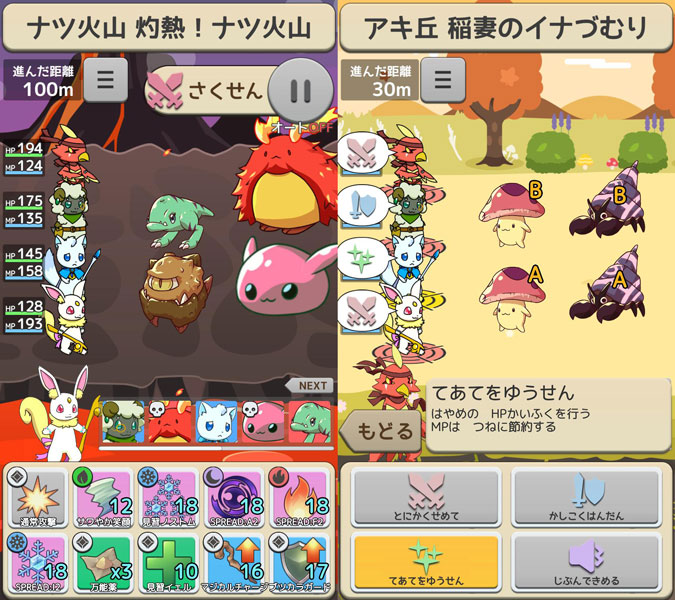 失った記憶を取り戻すために、マモノたちとのドキドキコマンドバトル! 最大10種類のアイテムや「おもいで」を自由に装備し、ダンジョンに挑戦しよう。 オートバトル機能で初心者でもサクサクプレイ、さくせんを指定することも可能。