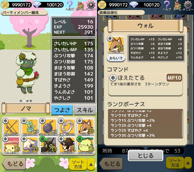 アイテムやマモノから手に入れた「おもいで」を強化&装備してパワーアップ! 強力なコマンドが使えるアイテムを付けるか、高いパラメータを持つ「おもいで」を付けるか、 どのような編成を組み立てるかはあなた次第。