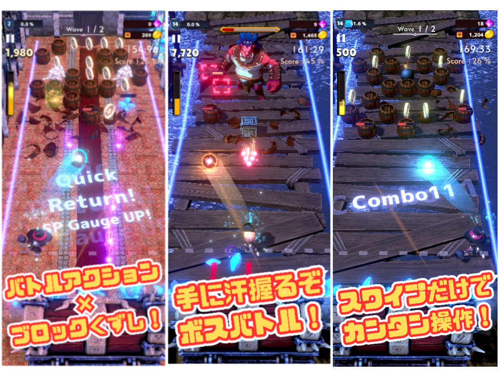 <キャラを操作するかんたんブロック崩し!> 普通のブロック崩しとは一味違う! キャラクターを操作して、スワイプ操作で狙い打とう! 指一本で複雑な操作はナシ。チュートリアルも数分で終わるぞ! <豊富なギミックとバトル!> ぶっ壊すブロックたちはギミック満載! 時には敵の攻撃をかわしたり、巨大なボスとのバトルも…!? <コミック調のデモで描かれる異世界ストーリー!> 異世界舞台のストーリーは、コミック調のデモで語られる。 キャラもカメラも、コマから飛び出さんばかりに動きまくるぞ!