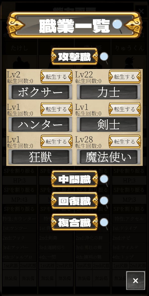 18つの職業から、職業を選択しキャラクターを育成できる! それぞれ、1つの特性と4つのスキルを持ち職業タイプ別に攻撃倍率が違うぞ! また、それぞれの職業から好きな特性とスキルと職業タイプを選択して新たな職業を自ら作れるシステムも搭載!