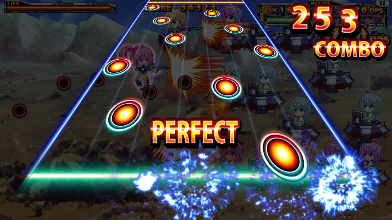 シンプル操作で音ゲー初心者でも安心! 降ってくるノーツを楽曲に合わせてタップorホールド!