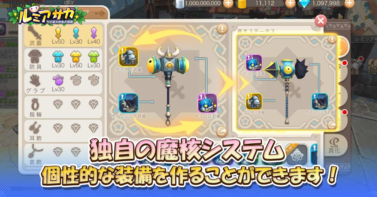 武器や衣装は3つの魔核で構成され、魔核をチェンジすると、武器や衣装の外見も変わります。自分の専属装備を作りましょう!