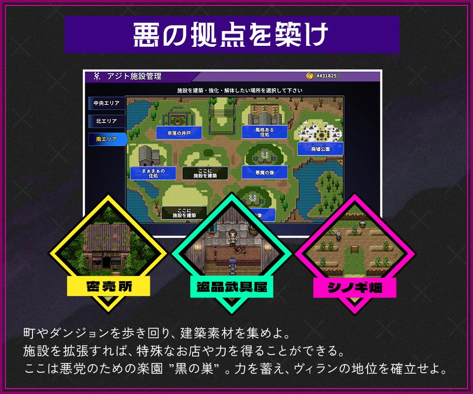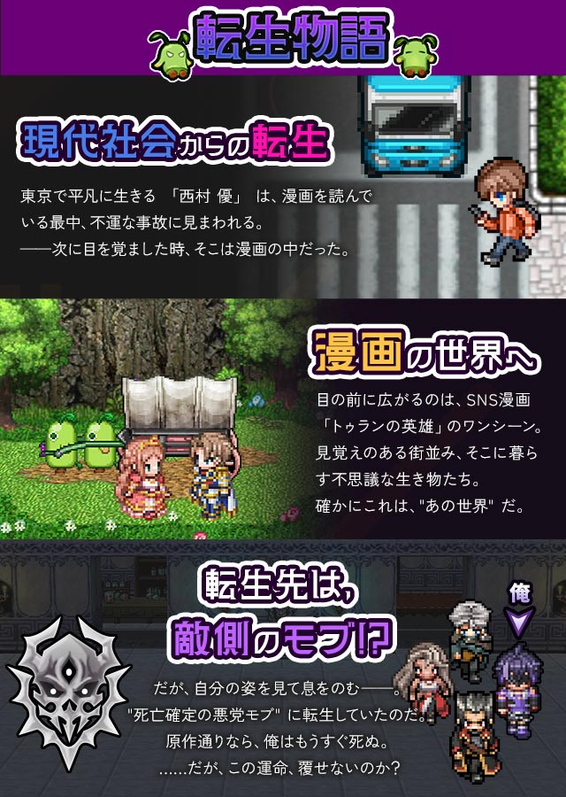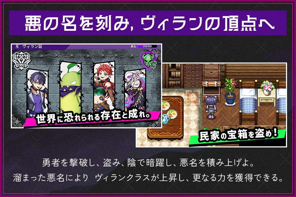 転生先は「悪役モブ」──しかも死亡確定!? 事故に巻き込まれ、異世界に転生。 そこは愛読していた漫画の世界の中で、自身は悪役モブキャラになっていた。 このままでは二度目の死は確定。ならば『悪(ヴィラン)』として抗うしかない! ■「悪名」を稼いでランクアップ! 民家の宝箱を開封・勇者討伐……「悪行」を重ねて「悪名」を高め、 ヴィランとしての階段を駆け上がれ! ■自分だけの拠点を築け 集めた素材で悪の拠点「黒の巣」を発展! 施設を建築し、特別なショップや機能を解放しよう。 暗躍し、成り上がり、 悪の物語を自分の手で描け。