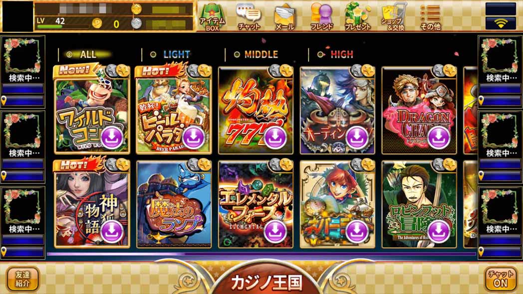 チュートリアル突破!で2000SPIN分の銀貨20万枚が貰える!! 手に入れろBIG WIN!! これまでの常識を覆す激アツボーナスの数々! 大量コイン獲得で興奮必至!! アジアで爆発的人気による中毒者続出のカジノスロットゲーム 「カジノ王国」が満を持して登場!! ◆個性的豊かなカジノスロットゲームが満載! 自分のお気に入りカジノスロットゲームで毎日楽しく遊べます! 大量コイン獲得の爽快感と満足感でハマること間違いなし! 新作ゲームも続々登場します! ■主なゲーム紹介 ・ドラゴンクレイドル 一撃万枚を狙える激アツボーナスステージが君を待っている!!美麗スロットで熱くなれ!! ・Crazy牧場 メインリールとサブリールの組み合わせが特徴のスロットゲームです!配当に最大で32倍の倍率が掛けられるぞ!! ・灼熱777 スロットマシーンの王道!センターラインに図柄が揃うとコイン獲得!!灼熱WILDを狙え!! みんなで盛り上がれる機能が満載! ◆チャット機能 ・全体チャット:色んな人のチャットが見れるから見ているだけでも楽しくなっちゃう!自分からどんどんチャットしてプレイヤー仲間達と一緒に盛り上がろう! ・密談チャット:プレイヤーと2人だけで利用できる個別チャットです!ゲーム攻略について語り合ったり、ボーナスゲームで獲得したコイン枚数を自慢したり!ゲームと離れて日常の出来事を共有しあったり、周囲を気にせず、2人で繋がる親密チャットが出来ちゃいます!! チャット機能はあなたの用途に合わせて、使い方は自由自在♪ 【推奨端末】iOS10以上のiPhone、iPad 最低メモリ:2GB以上 ストレージ容量:1GB以上の空