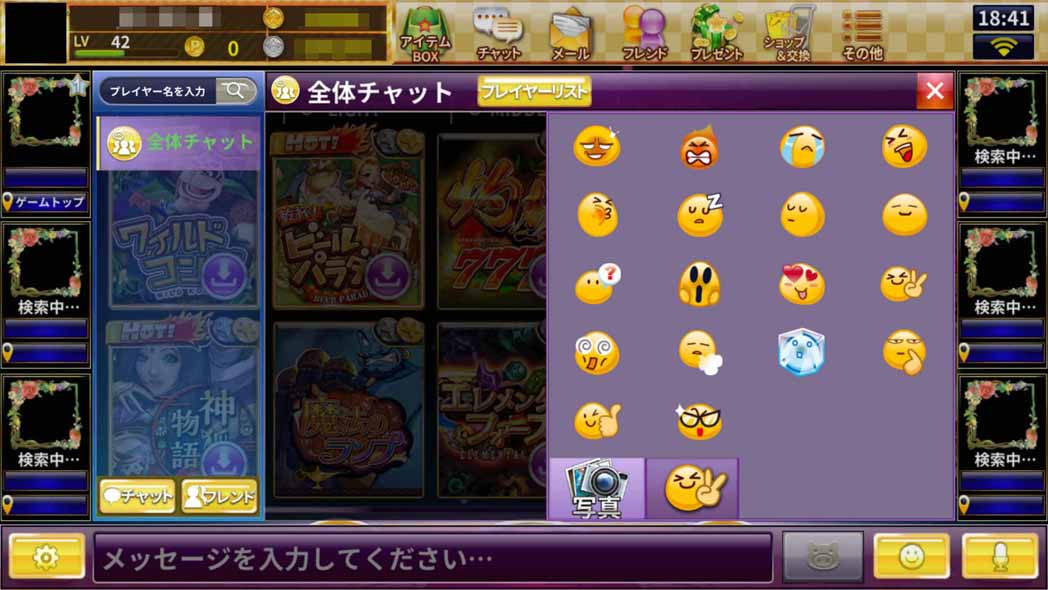 カジノ王国オリジナルの絵文字を使って、他のプレイヤーとチャットでコミュニケーションができるよ!
