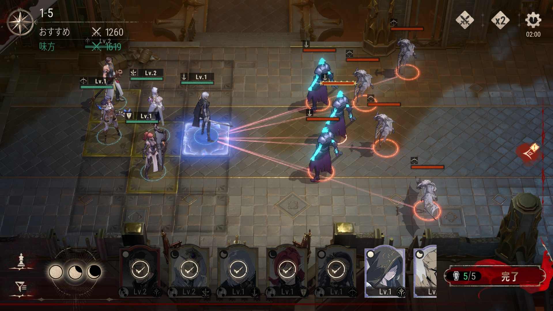 近距離・中距離・遠距離の3つのエリアに最大5人の眷属を自由に配置できるバトルシステムが特徴。敵の編成を確認して戦術的に配置を考えることで、戦いを有利に進めることができる。 基本的な戦闘はオートで進行する仕組みとなり、キャラクターを配置するだけで自動的に戦闘が行われる。