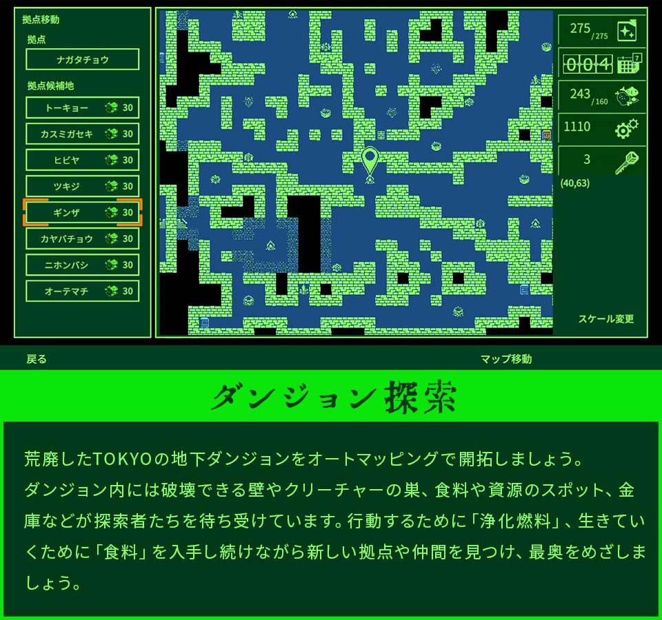荒廃したTOKYOの地下ダンジョンをオートマッピングで開拓しましょう。 ダンジョン内には破壊できる壁やクリーチャーの巣、食料や資源のスポット、金庫などが探索者たちを待ち受けています。