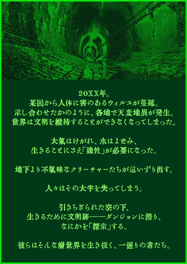 荒廃したTOKYOの地下ダンジョンをオートマッピングで開拓しましょう。 ダンジョン内には破壊できる壁やクリーチャーの巣、食料や資源のスポット、金庫などが探索者たちを待ち受けています。