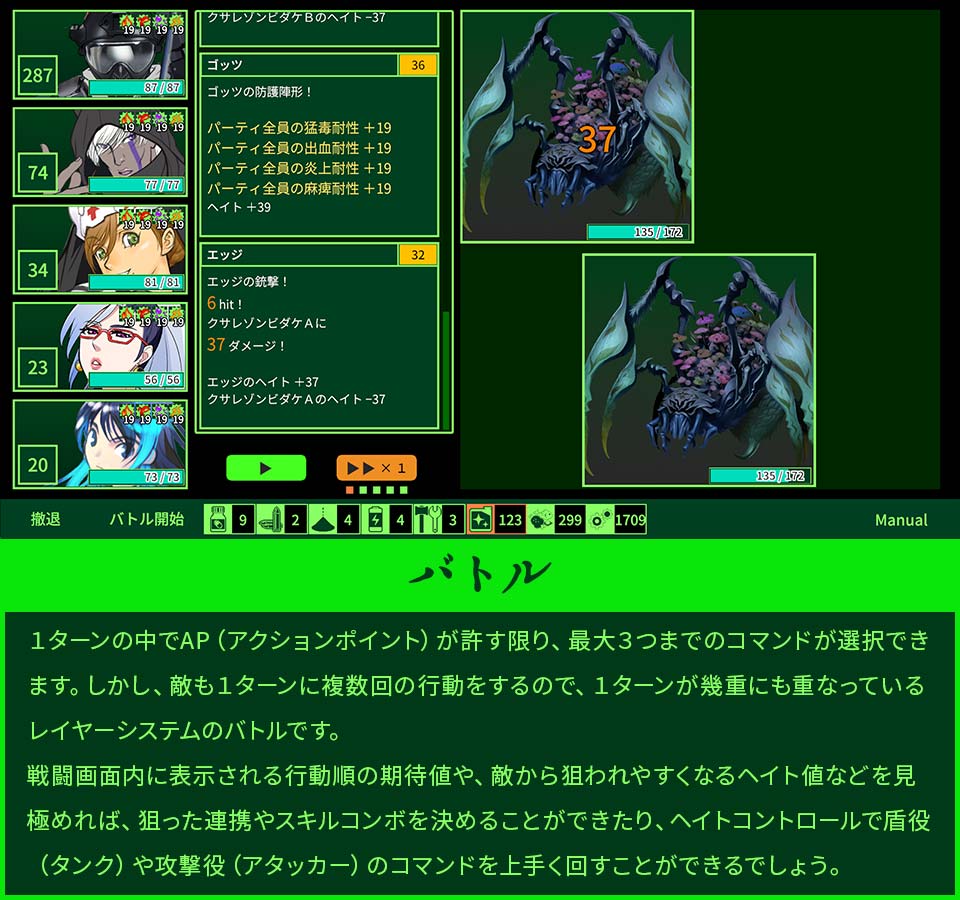1ターンの中でAP(アクションポイント)が許す限り、最大3つまでのコマンドが選択できます。 敵も1ターンに複数回の行動をするので、1ターンが幾重にも重なっているレイヤーシステムのバトルです。 戦闘画面内に表示される行動順の期待値や、敵から狙われやすくなるヘイト値などを見極めれば、狙った連携やスキルコンボを決めることができたり、ヘイトコントロールで盾役(タンク)や攻撃役(アタッカー)のコマンドを上手く回すことができるでしょう。