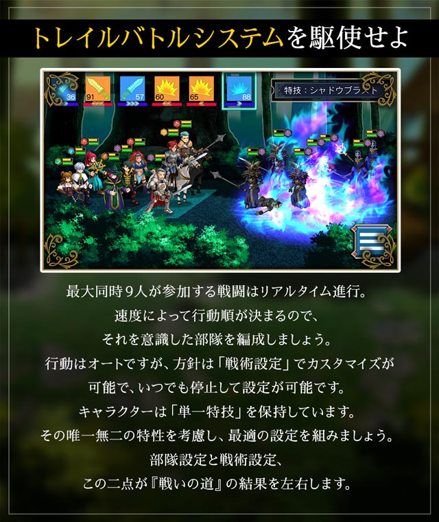 最大同時9人が参加する戦闘はリアルタイム進行。 速度によって行動順が決まるので、それを意識した部隊を編成しましょう。 戦闘はオートで進行しますが、事前に攻撃・特技の比率を設定する事が可能です。 スキルは「単一特技制」を採用しています。その唯一無二の特性を考慮し、最適の設定を組みましょう。 部隊設定と戦術設定、この二点が『戦いの道』の結果を左右します。
