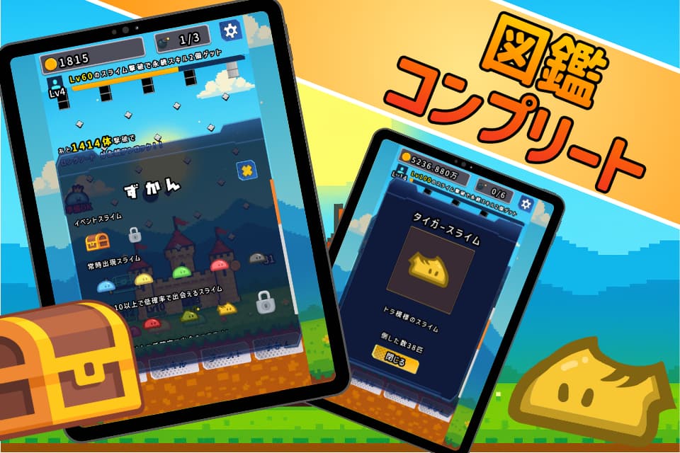 出現スライムにはさまざまな種類があり、それぞれを倒すことで図鑑に登録されていきます。図鑑をコンプリートする楽しさはもちろん、見た目もユニークなスライムたちを集めることで、プレイの楽しみがどんどん広がっていきます。