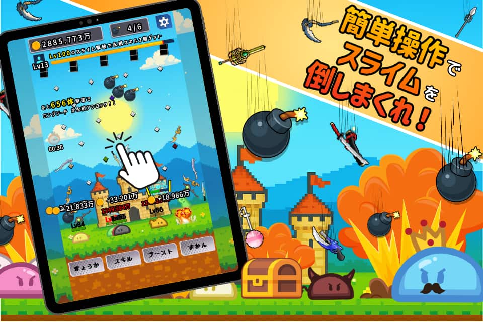 タップ一つで爆弾が落ち、ピンボールの釘の間をコロコロ通り抜けてスライムに命中し爆発。誰でもすぐに楽しめる手軽さと、スカッと気持ちいい爽快感で、気づけば夢中になってしまうはずです。