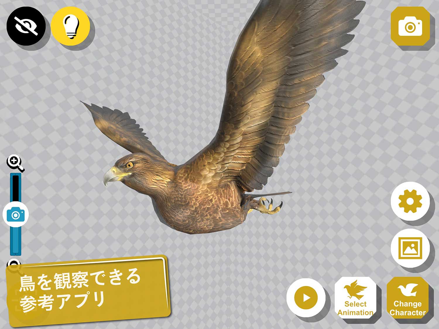 漫画やアニメ、イラストなどで鳥の資料が欲しいなという方に本アプリを使っていただけると幸いです。 360度どの角度からも眺めることができます。 鳥の動きのアニメーションを一時停止してお気に入りの瞬間を画像書き出ししてトレース用に使用することも可能です。