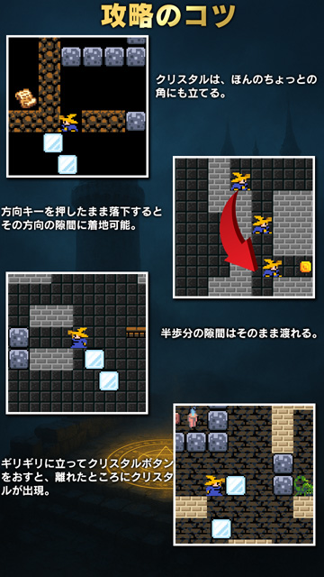 「これ、いけないんじゃぁ...」って思ったらちょっと冷静になって、以下のことを試してみてください。 ■クリスタルは、ほんのちょっとの角にも立てるようになっています。 ■方向キーを押したまま落下すると壁に沿って落下するので、その方向の隙間に着地可能になっています。 ■半歩分程度の隙間は、そのまま渡れます。 ■ギリギリに立ってクリスタルボタンをおすと、離れたところにクリスタルが出現。