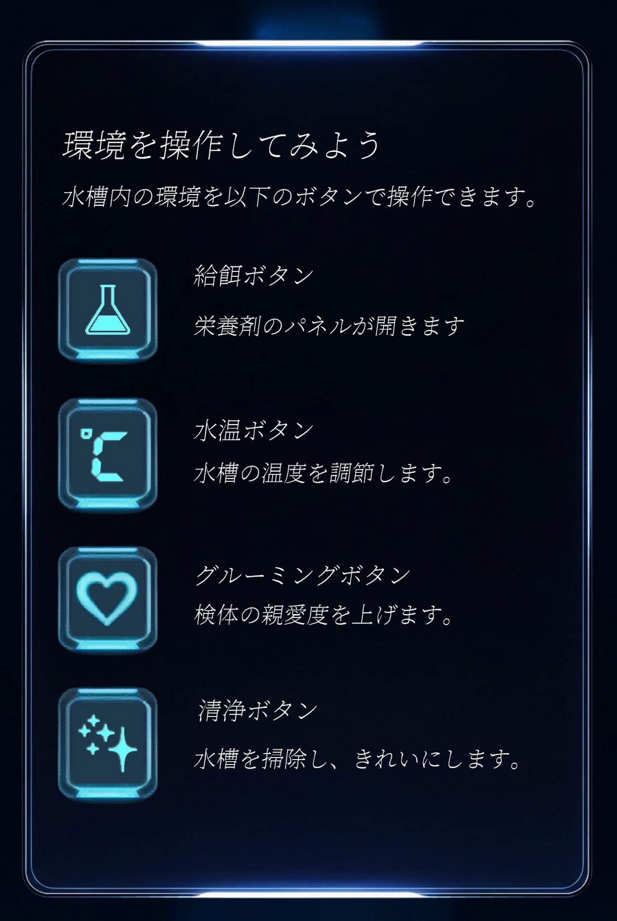 以下のボタンを利用して育成します。 ・給餌ボタン…検体に栄養を与えます。 ・水温ボタン…水槽の温度を変更します。 ・グルーミングボタン…検体の親愛度を上昇させます。 ・清浄ボタン…水槽の汚れを浄化します。