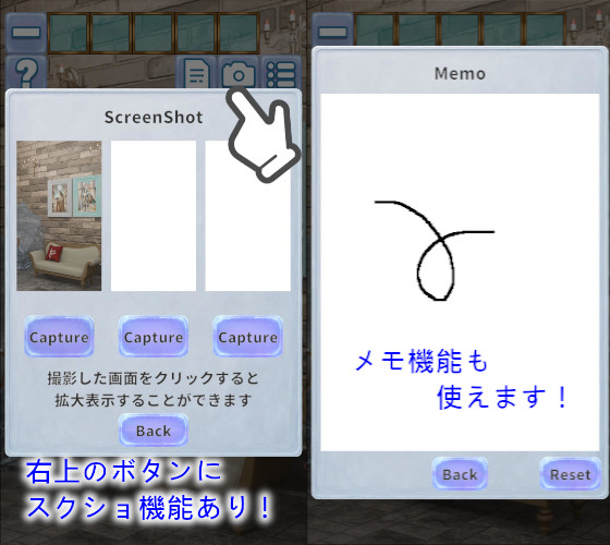 スクリーンショットや、メモ機能など、脱出を助ける機能もあります!難しい脱出ゲームは苦手という方は、是非これらの機能を使ったクリアまでたどり着いてください。 謎解きが難しい場合には、ヒント・答えを見ることができる機能もあります。つまってしまった時には、積極的に活用してみてください。