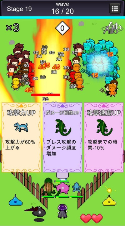 バトルはかんたん操作。 毎ウェーブ、提示される3枚のカードから1枚を選ぶだけ。 攻撃力アップ、攻撃速度アップ、特殊効果など、選択が戦況を左右します。 あとはキャラクターたちの活躍を信じて、のんびり眺めましょう。 バトルが終わったら、拠点で装備やモンスターを強化。 育成した戦力で再びバトルに挑み、ステージを進めていきます。 「選択 → 見守り → 強化」を繰り返しながら、少しずつ魔王軍を成長させていくゲームです。