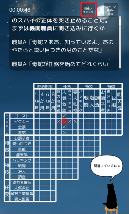 間違いチェック機能を使うと猫さんが間違いの有無を教えてくれる! 詰まって進めなくなった、矛盾が発生した、そんなときには猫さんに頼ってみよう