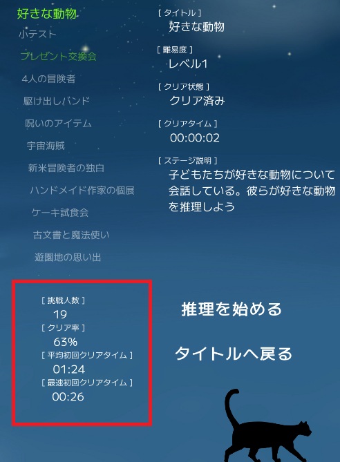 ステージ選択画面では挑戦人数やクリア率、クリアタイムなどの統計情報が確認できる。 全国の探偵が苦戦する難問へ挑戦してみよう!