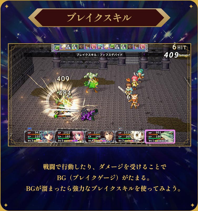 戦闘で行動したり、ダメージを受けることでBG(ブレイクゲージ)がたまる。 BGが溜まったら強力なブレイクスキルを使ってみよう。
