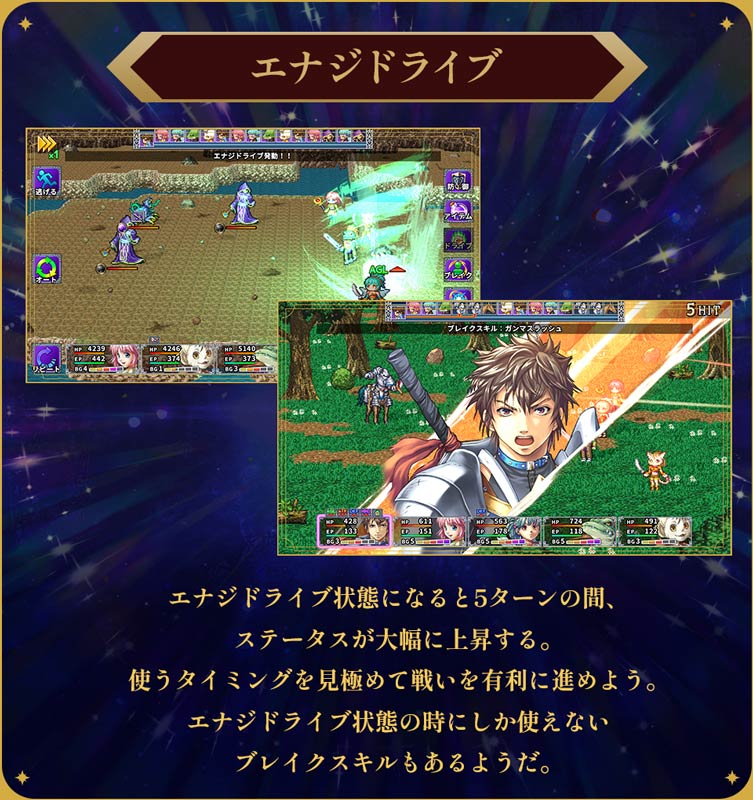 エナジドライブ状態になると5ターンの間、ステータスが大幅に上昇する。 使うタイミングを見極めて戦いを有利に進めよう。 エナジドライブ状態の時にしか使えないブレイクスキルもあるようだ。