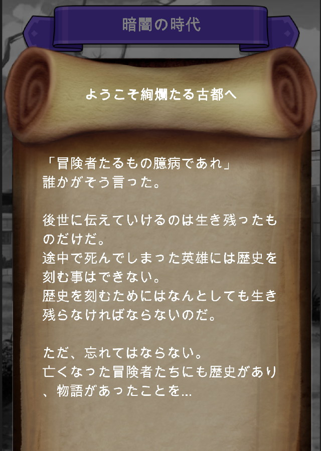 あなたが旅立たせた冒険者は探索中に様々な洞窟や建物を発見していくだろう。 この世界はとても広く、様々な土地やモンスターそして謎があることに気がつくだろう。 テキストで楽しめる正統派ファンタジーがここにある。