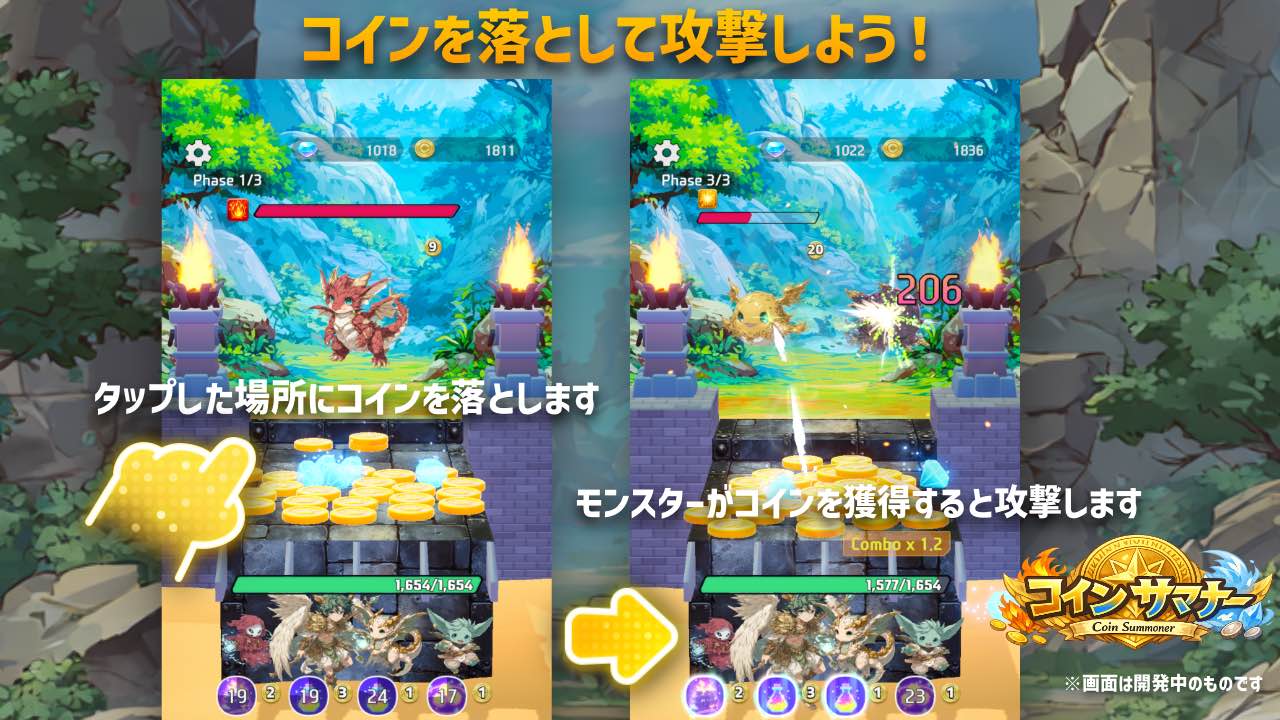 コインはタップした場所に落とすことができます。 自陣のモンスターにコインが落ち、獲得すると対象モンスターが攻撃をします。 攻撃に必要なコインの枚数はモンスターごとに異なります。 敵もコインカウントに応じて行動をしてきます。 ターン制RPGさながらの緊張感、そしてコイン落としによる爽快感を同時に体験することができます。