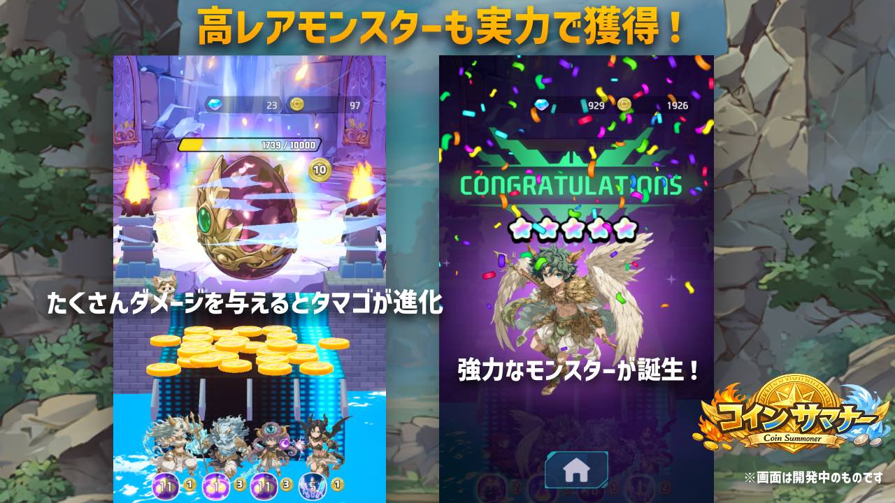 本ゲームにはいわゆるガチャはありません。 育てたモンスターでタマゴにダメージを与えていくと、より強いモンスターが誕生するタマゴにグレードアップします。 育てたモンスターとあなたのコイン落としテクニックで最強モンスターを獲得しましょう。