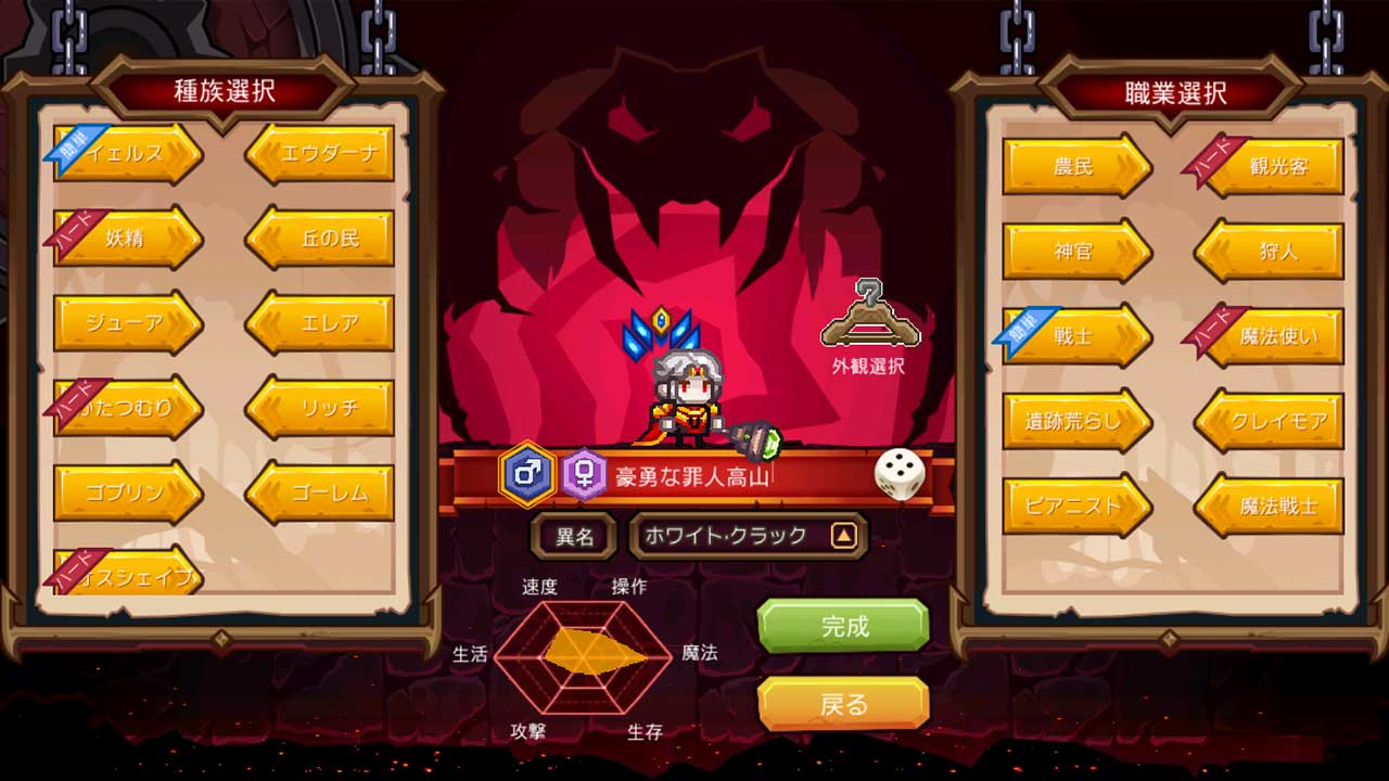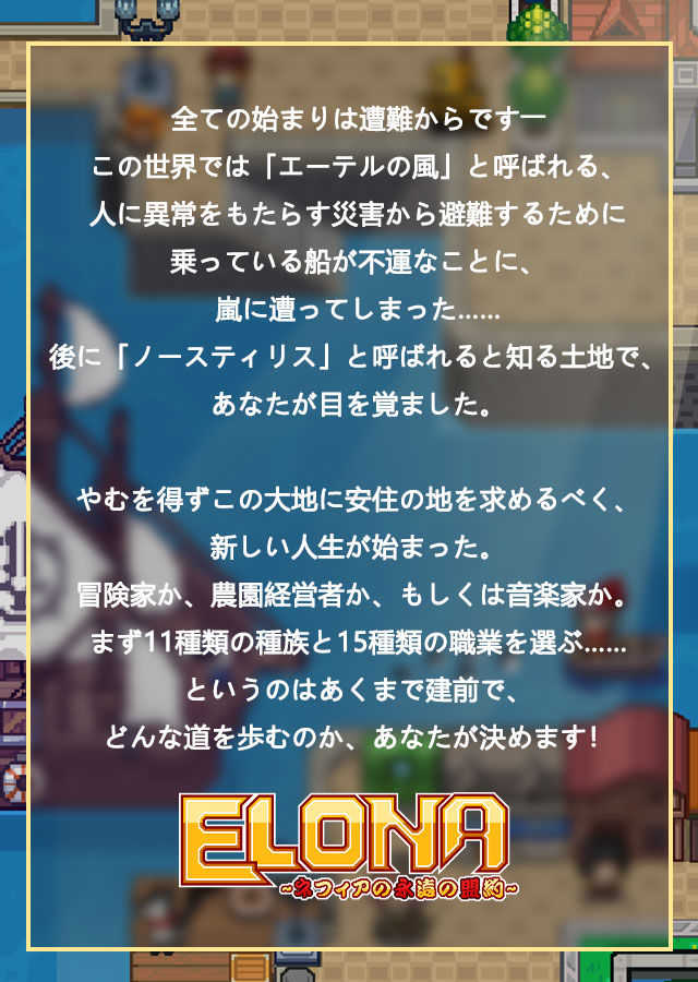 あの名作「Elona」がスマホに帰ってきた!高自由度とやりごたえのあるRPGはいつでもどこでも!ファンタジーの世界にいきなり放り出されてさぞ不安でしょうが、親切な(?)ガイド・エルさんが手取り足取りで新世界での生活を教えてあげます。そしていざ慣れたら、誰でもこの異世界での生活を楽しめます。 自動ルートとか、モンスター狩りとか、そんな作業みたいなものはちっとも楽しくない。常に新しい発見にワクワクするあの時の気持ちをもう一度思い出せる、そんな世界と人生です。 全ての始まりは遭難からです――この世界では「エーテルの風」と呼ばれる、人に異常をもたらす災害から避難するために乗っている船が不運なことに、嵐に遭ってしまった……後に「ノースティリス」と呼ばれると知る土地で、あなたが目を覚ました。やむを得ずこの大地に安住の地を求めるべく、新しい人生が始まった。冒険家か、農園経営者か、もしくは音楽家か。まず11種類の種族と15種類の職業を選ぶ……というのはあくまで建前で、どんな道を歩むのか、あなたが決めます!