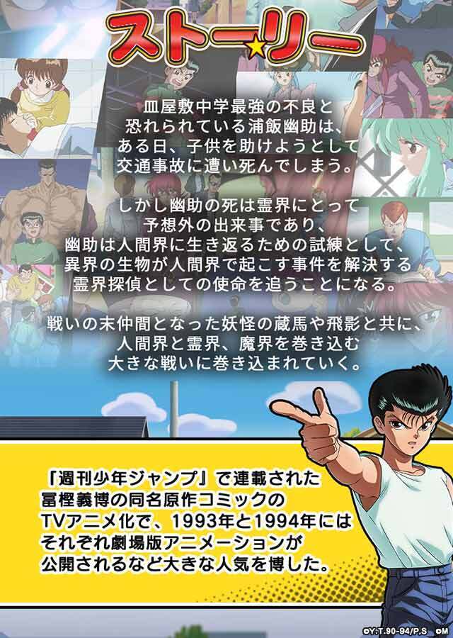 CV: 佐々木望浦飯幽助は皿屋敷中学に通う不良学生だ。授業もまともに受けず、教師にも反抗するが、根は子どもにも優しい正義漢。だがある日、自動車事故に巻き込まれてしまい…!?伊達にあの世は見てねぇぜ!!
